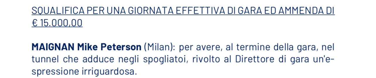 Come si legge nel comunicato, il portiere francese è stato squalificato per una giornata e sarà costretto a pagare un’ammenda da 15 mila euro “per avere, al termine della gara, nel tunnel che adduce negli spogliatoi, rivolto al Direttore di gara un’espressione irriguardosa”.