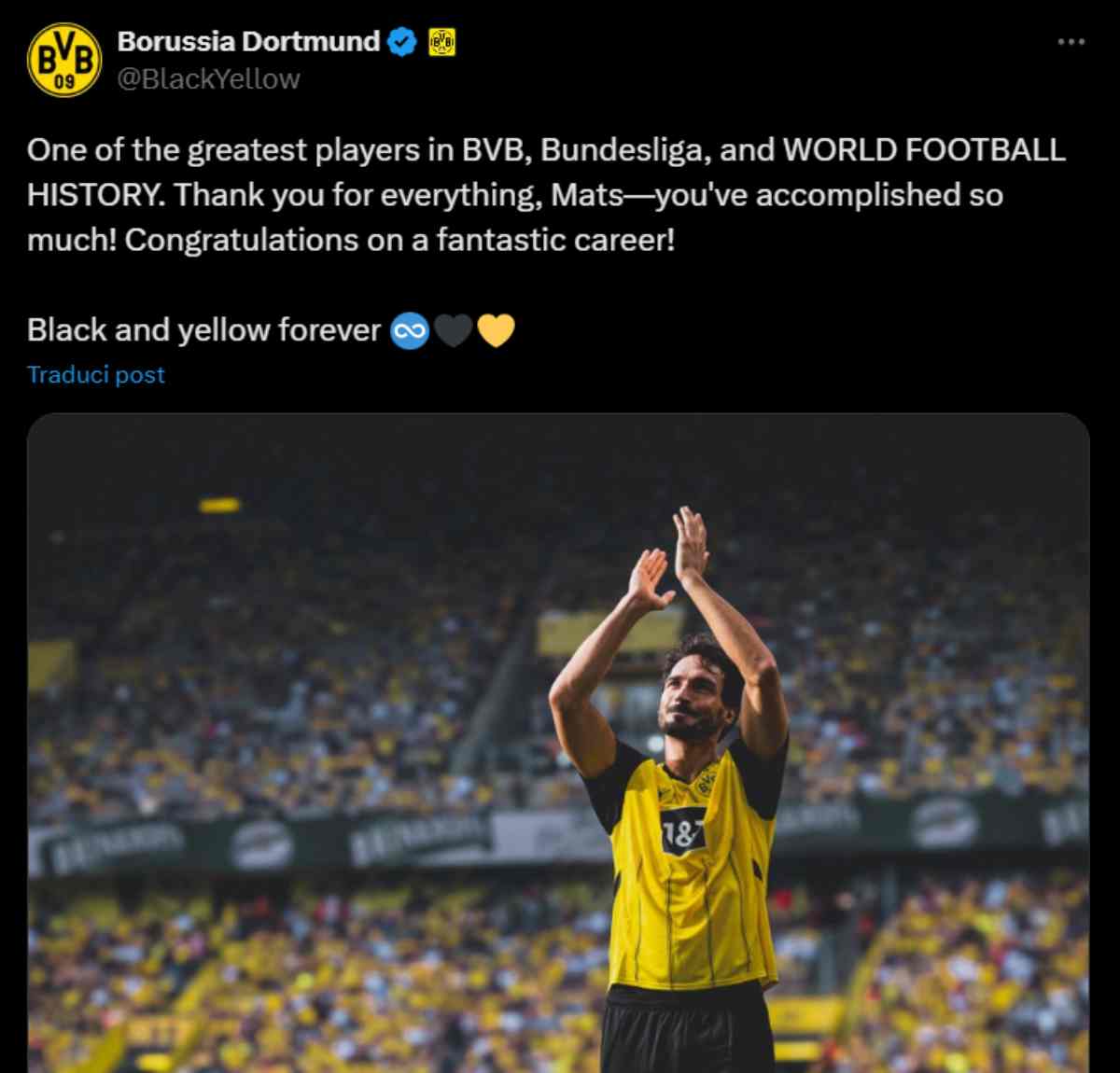 Il post su Instagram di Hummels: il difensore dice addio al calcio