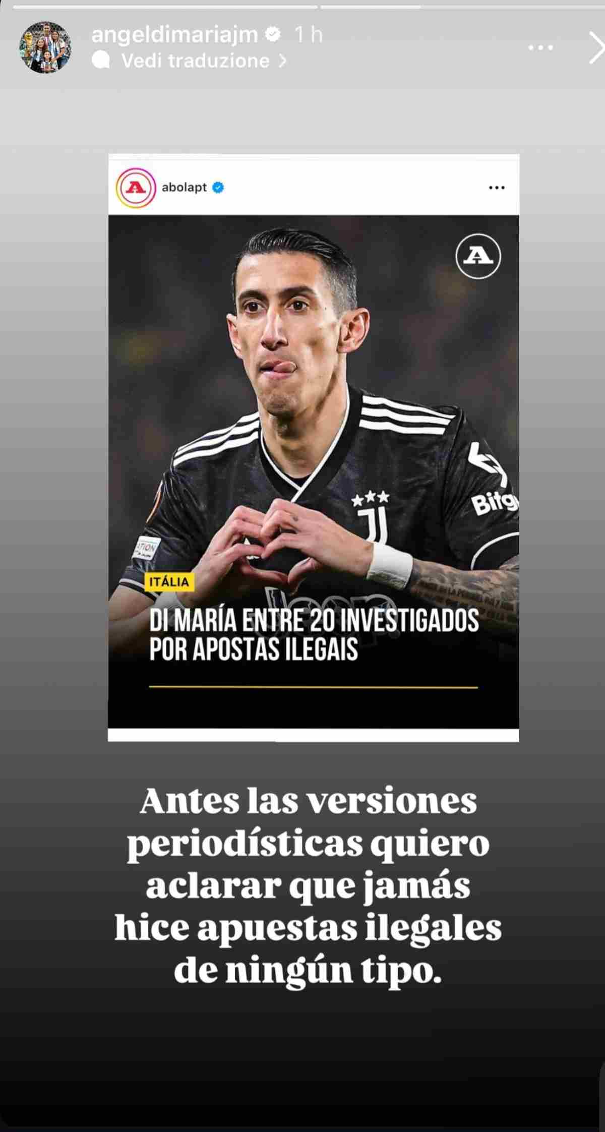 Dopo essere stato inserito nella cerchia dei calciatori ‘scommettitori’, il campione del Mondo con l’Argentina, il Fideo Di Maria ha voluto fare chiarezza con una storia sul proprio profilo Instagram: “Prima di pubblicare notizie di stampa, vorrei chiarire che non ho mai fatto scommesse illegali di alcun tipo“.
