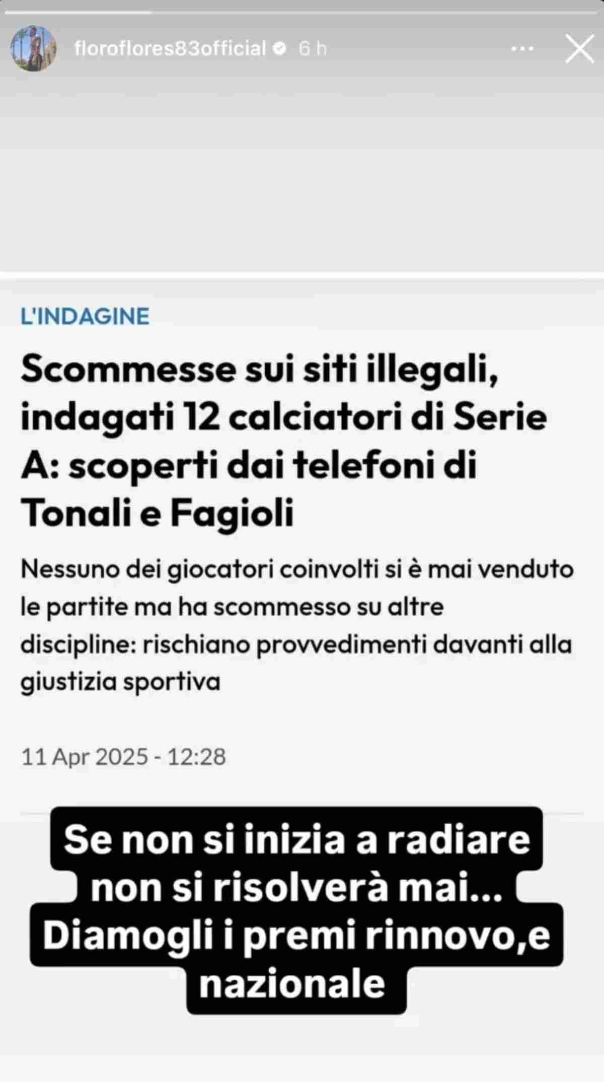 Antonio Floro Flores, ex attaccante di Sassuolo e Napoli, non le manda a dire sulle sue Instagram Stories. L’ex attaccante di Serie A ha pubblicato una storia sul proprio Instagram in cui ha criticato duramente il comportamento di alcuni calciatori, in modo particolare di coloro che sono stati indagati per il caso scommesse sui siti illegali.