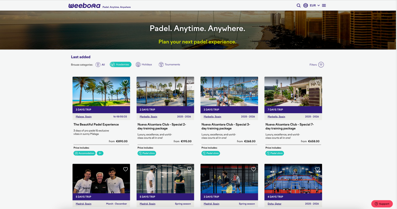 La piattaforma collabora inoltre con alcune delle più prestigiose academy di padel al mondo, come la Gustavo Pratto Academy, la M3 Academy, la Paquito Navarro Academy, la nuovissima G24 Academy di Charlie Pozzoni, la Pablo Ayma Academy e molte altre. Weebora ridefinisce il concetto di viaggio nel padel, combinando il miglior insegnamento tecnico con esperienze di viaggio su misura, nelle più esclusive accademie e resort specializzati. A tutto questo si aggiunge il progetto di sviluppo del “Modulo Weebora”, un protocollo studiato con le academy partner per garantire un apprendimento veloce e un miglioramento progressivo, indipendentemente dalla destinazione di viaggio scelta. Grazie a una piattaforma digitale avanzata, ogni itinerario può essere personalizzato in base alle esigenze dei clienti, integrando sport, cultura e intrattenimento per un’esperienza a 360°. La piattaforma offre un’esperienza in 4 diverse lingue – italiano, spagnolo, inglese e francese – e pagamenti in 5 valute – dollaro americano, euro, sterlina, franco svizzero e dollaro canadese.