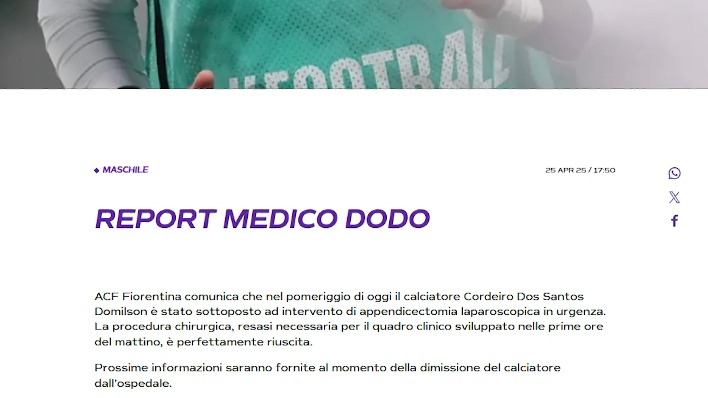 Non arrivano buone notizie in casa Fiorentina dopo il forfait a Cagliari di Moise Kean, dovuto a problemi familiari che lo vedono ancora a Parigi e difficilmente in campo contro l’Empoli, i viola perdono anche Dodo. Il terzino reduce da un’ottima prova in Sardegna ha accusato nelle ultime ore dolori addominali che l’hanno costretto al ricovero in ospedale causa una appendicite che lo potrebbe costringere a saltare non soltanto l’Empoli. Ma anche diversi altri match con i tempi di recupero che nel peggiore dei casi potrebbero allungarsi fino a 3-4 settimane.