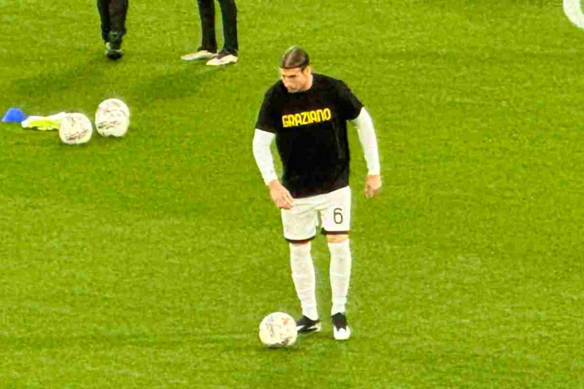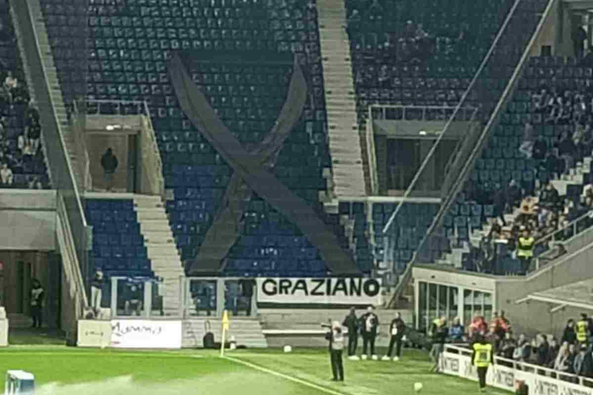 Nel settore ospiti, completamente vuoto, era presente un grande fiocco nero, sopra la scritta “Graziano” sulla balaustra.