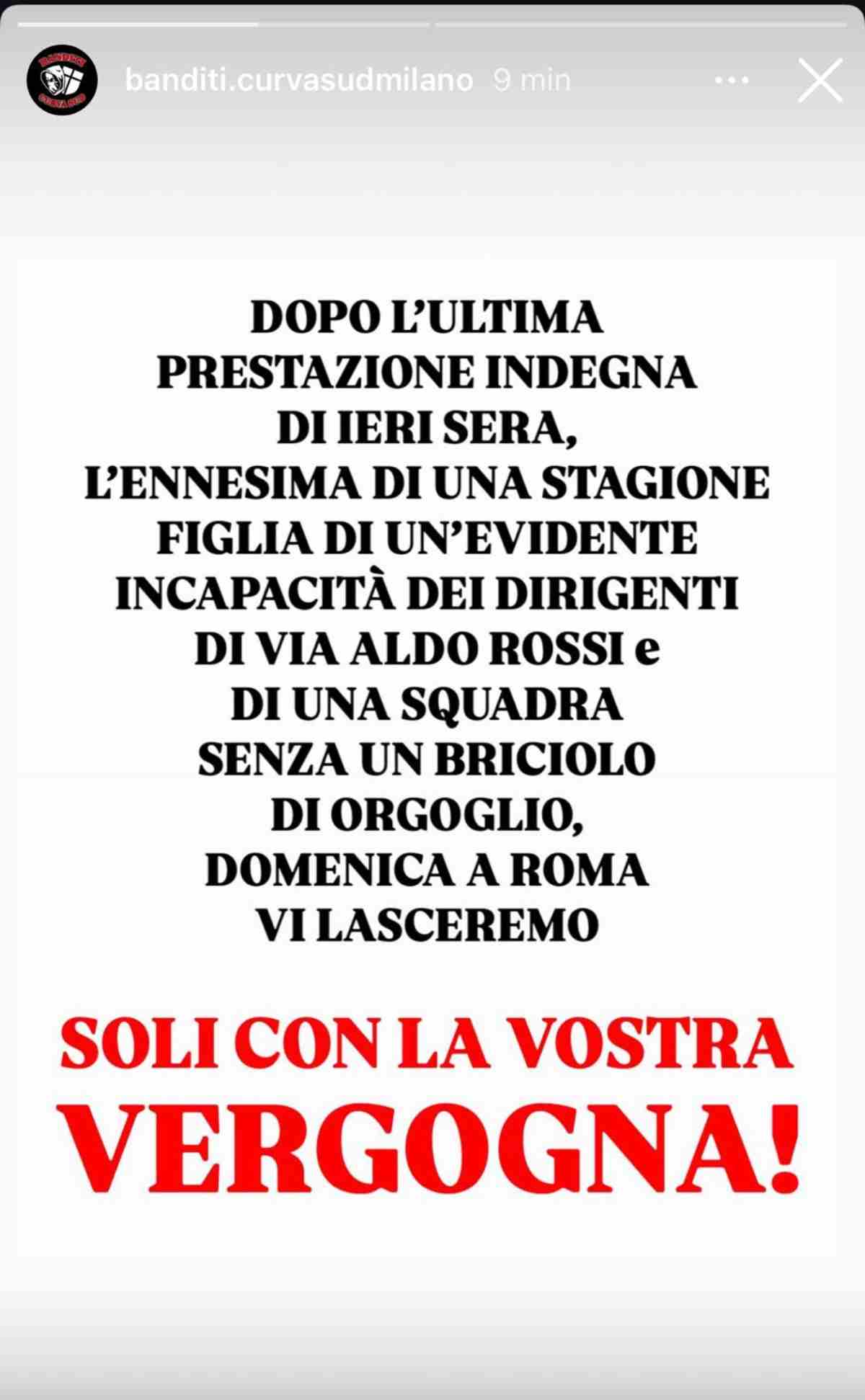 Poi aggiunge: “Domenica a Roma vi lasceremo soli con la vostra vergogna!”: contestazione dura e silenziosa con la Curva rossonera che non ci sarà in trasferta in casa della Roma.