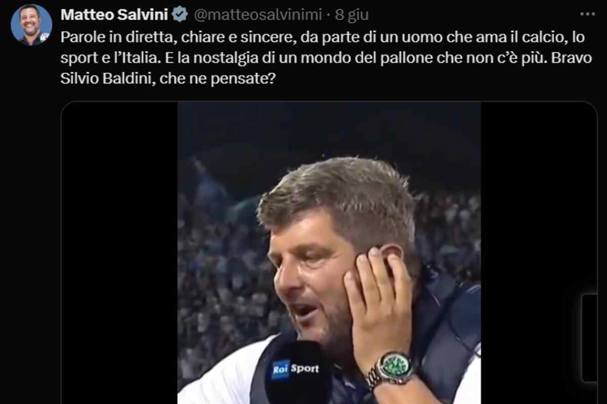 Tra i tanti che hanno commentato le parole del tecnico del Pescara, anche il vice premier Matteo Salvini che ha voluto dedicare un post sui propri canali social: “Parole in diretta, chiare e sincere, da parte di un uomo che ama il calcio, lo sport e l’Italia. E la nostalgia di un mondo del pallone che non c’è più. Bravo Silvio Baldini, che ne pensate?”