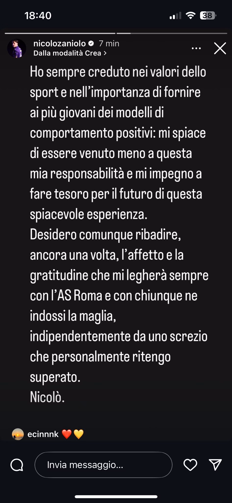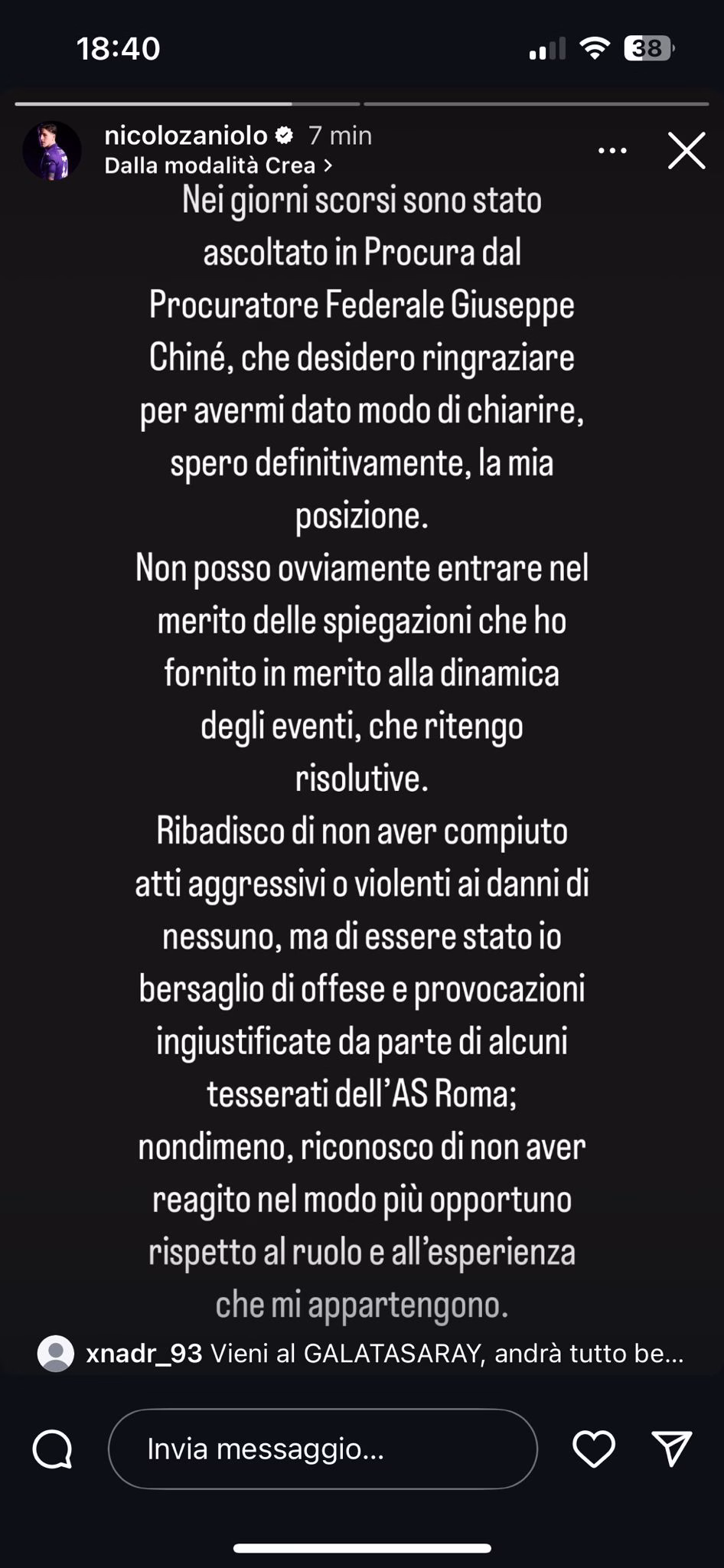 Tramite due storie sul proprio profilo Instagram, Nicolò Zaniolo ha voluto informare di essere stato ascoltato in Procura dal Procuratore Federale Giuseppe Chiné, che desidera ringraziare per avergli dato modo di chiarire in modo che lui spera definitivo la propria posizione.