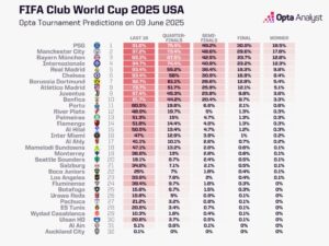 Il supercomputer di Opta ha stilato la classifica delle probabilità di vittoria per tutte le 32 squadre che prenderanno parte al Mondiale per club, al via il 14 giugno negli Stati Uniti. Nove club partono con uno sconfortante 0% di possibilità di alzare il trofeo. Altri sei hanno lo 0,1% di chance, tra cui l’Auckland, che ha meno dell’1% di superare il girone. Due squadre si attestano sullo 0,2%, quattro arrivano allo 0,3%, come l’Al Hilal, mentre il Porto tocca lo 0,6%, restando comunque sotto l’1%.
