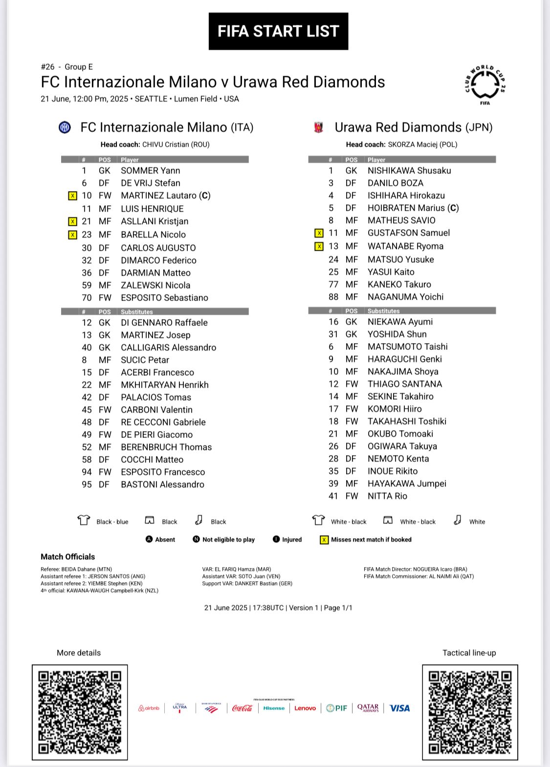 Dopo il pareggio contro il Monterrey nella sfida di debutto al Mondiale per Club, l’Inter torna in campo contro l’Urawa Reds, sfida valevole per la seconda giornata. Pavard neanche in panchina per il riacutizzarsi del problema alla caviglia.