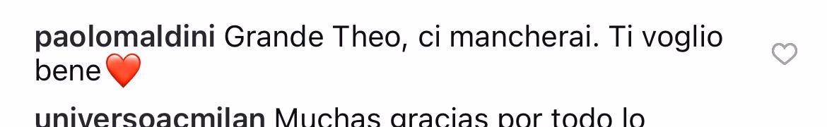 Arriva anche il saluto dell’ex capitano rossonero e dirigente Paolo Maldini: “Grande Theo, ci mancherai. Ti voglio bene”. Un breve messaggio che però fa rumore, visto che arriva sotto ad un attacco di questo tipo.