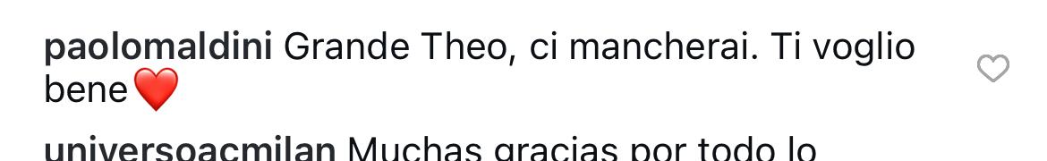 Arriva anche il saluto dell’ex capitano rossonero e dirigente Paolo Maldini: “Grande Theo, ci mancherai. Ti voglio bene”. Un breve messaggio che però fa rumore, visto che arriva sotto ad un attacco di questo tipo.