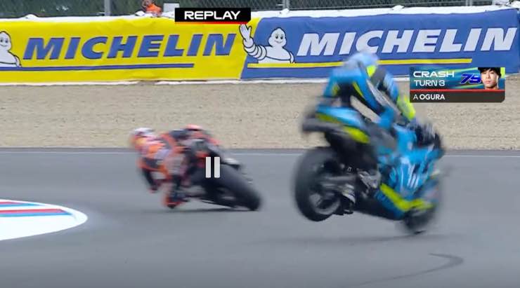 La moto gira come una trottola, colpisce duramente Ogura che finisce nella ghiaia al bordo del circuito. Il pilota batte duramente la spalla sinistra ma, per fortuna o per opera di un angelo custode, Ogura si rialza da solo e cammina. Sta bene, solo tanta paura e forse, qualche bel livido. Ed un video spettacolare da aggiungere all’elenco di volte in cui il giapponese è volato giù dalla sella.