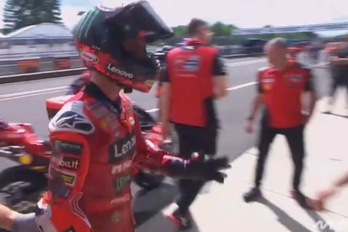 Un episodio che Bagnaia non è riuscito proprio a digerire: lo si capisce anche dallo sguardo visibilmente arrabbiato al suo rientro ai box, dove si è lasciato andare anche a un gesto di stizza. Non è chiaro a chi fosse rivolto: probabilmente a nessuno in particolare, semplicemente era uno sfogo per l’indicazione errata che gli ha di fatto rovinato la prestazione.