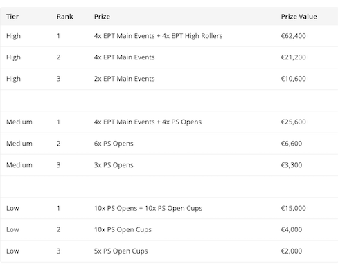 In sintesi: i giocatori accumulano punti in tre categorie (High, Medium, Low) in base al buy-in e alla posizione finale nei tornei dell’EPT e del PS Open. Questi sono i premi in palio per ciascuna categoria: