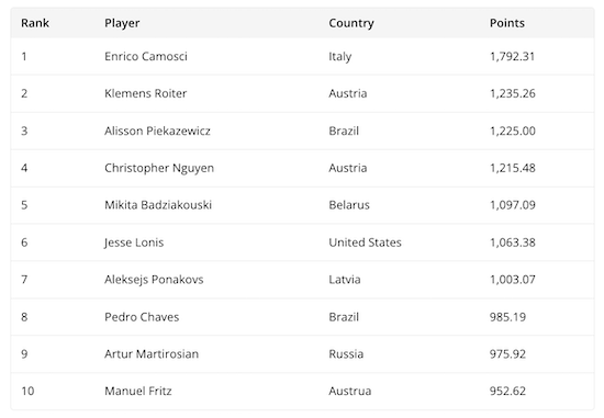 Già così, Camosk ha scavato un solco di oltre 500 punti sul primo degli inseguitori, l’austriaco Klemens Roiter (Austria). Dovrà però fare attenzione a due giganti dei tornei ad alto buy-in: Mikita Badziakouski (5°) e Jesse Lonis (6°). Ecco la top 10: