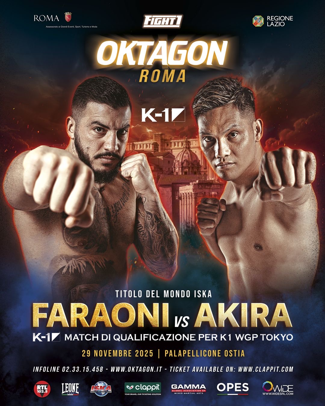 Il match Faraoni-Akira Jr. infatti è stato deciso dalla promotion nipponica che detiene i diritti del popolare K-1 in collaborazione con il board della stessa ISKA. Il premio, per il vincitore di Oktagon Roma 2025, sarà l’ingresso nel K-1 WGP a partire dalla prossima stagione (nel 2026). La vittoria, di uno dei due campioni, coinciderà con l’ingresso, dalla porta principale, nel circuito simbolo della kickboxing mondiale (diventato popolare per la severa fase ad eliminazione diretta).