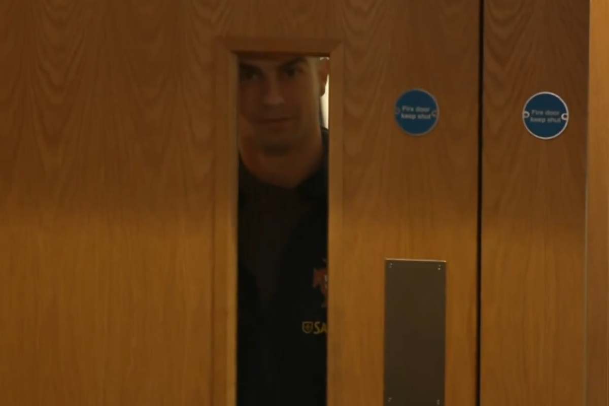 Prima della conferenza Cristiano Ronaldo si è divertito con poco, come se stesse giocando… a nascondino, prima di presenziare in sala stampa e sottoporsi alle domande dei giornalisti.